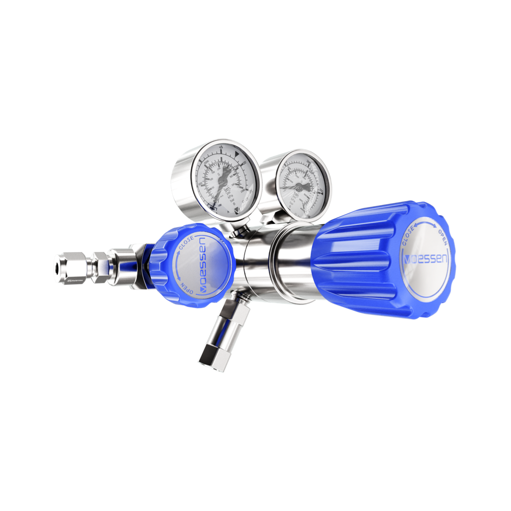 Редуктор баллонный VOESSEN CRC62CHNS с мембранной системой редуцирования, для нетоксичных и некоррозионных газов чистотой до 6.0 (99,9999%) из хромированной латуни, регулирующий избыточное давление, двухступенчатый, 6 портов, вход справа, запорный мембранный вентиль (клапан) на выходе, входное давление 200 бар, выходное давление от 0 до 4 бар, присоединение к баллону - DIN9 (G3/4", гайка под ключ), трубный обжимной фитинг из нержавеющей стали 1/4" на выходе, расход газа до 20 м3/час