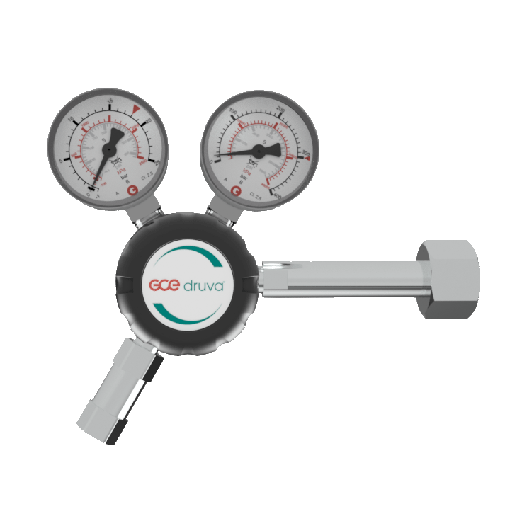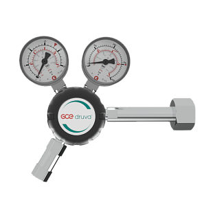 Редуктор баллонный GCE DruvaPUR CPLH0DJR00 с мембранной системой редуцирования, для некоррозионных и нетоксичных газов чистотой до 6.0 (99,9999%) из хромированной латуни, регулирующий избыточное давление, с FKM-уплотнением седла предохранительного клапана, двухступенчатый, 6 портов, вход справа, без опций, входное давление до 200 бар, выходное давление от 0 до 10 бар, присоединение к баллону DIN9 (G3/4" - гайка под ключ), трубный обжимной фитинг из нержавеющей стали 6 мм на выходе, расход газа до 20 м3/час
